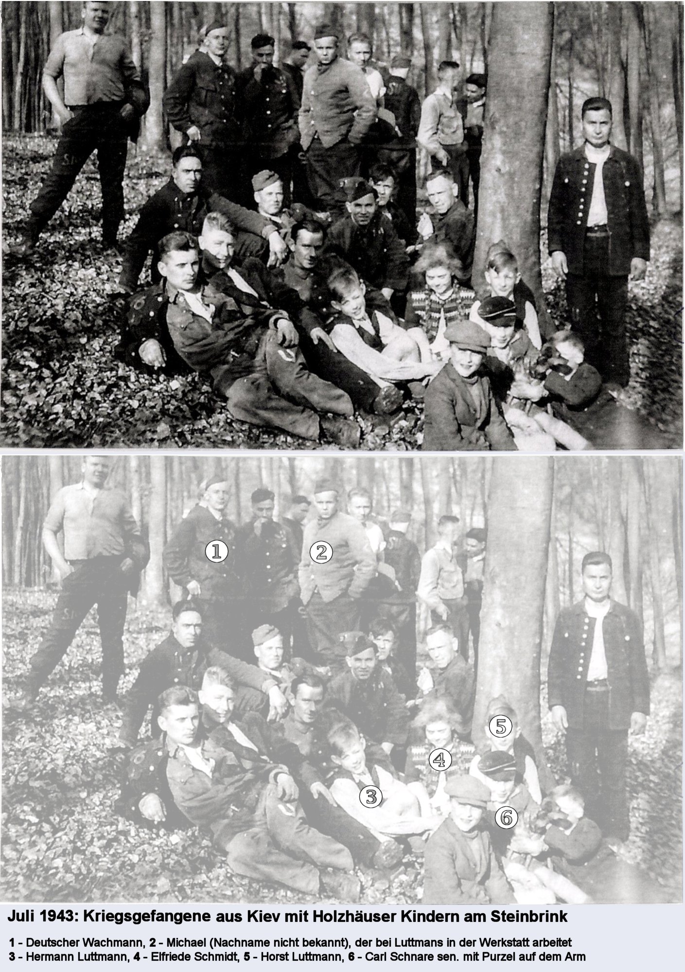 Zu erkennen sind: 1 - Deutscher Wachmann, 2 - Michael (Nachname nicht bekannt), der bei Luttmans in der Werkstatt arbeitet, 3 - Hermann Luttmann, 4 - Elfriede Schmidt, 5 - Horst Luttmann, 6 - Carl Schnare sen. mit Hund Purzel auf dem Arm