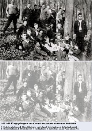 Über zwei Jahre waren vergangen, seit ich Horst Luttmann das letzte Mal besucht hatte. Vergangene Woche, bei meinem Pyrmont-Besuch, wurde es endlich wieder Zeit – natürlich nicht ohne mich vorher anzukündigen. Horst war bestens vorbereitet: Auf dem Tisch lagen bereits historische Fotos und Aufzeichnungen bereit, als ich eintraf. So zeigte er mir auch dieses Bild, das Kriegsgefangene bei einem Ausgang zum Steinbrink im Juli 1943 zeigt. Er erinnerte sich, dass die Atmosphäre trotz der Begleitung durch einen Wachmann zwanglos gewesen sei. Horst gehört zu jenen Menschen, die gerne aus ihrer Vergangenheit erzählen. So zeigte er mir auch dieses Bild, das Kriegsgefangene bei einem Ausgang zum Steinbrink im Juli 1943 zeigt. Er erinnerte sich, dass die Atmosphäre trotz der Begleitung durch einen Wachmann zwanglos gewesen sei.