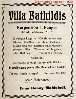 [[File:1920-Wohnungsanzeiger-Hs.Bathildis.jpg|mini|Haus Bathildis im Wohnungsanzeiger 1920]] | |||
