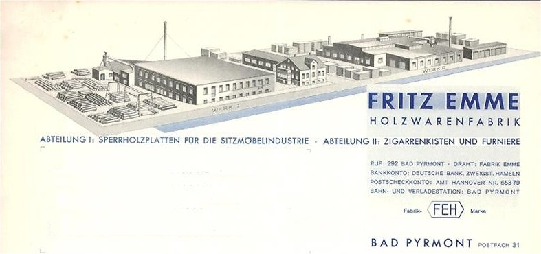 [[File:193x-Fritz-Emme-Holzwaren.jpg|left|frame|Briefkopf der Holzwarenfabrik Emme in den 1930er Jahren]] | |||