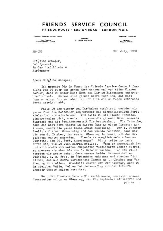 Das Rest-Home wurde etwa 1951/52 vom St. Josephs-Haus in das Birkenhaus verlegt. Als Grund dafür mag die Zugehörigkeit meiner Großmutter Elisabeth Jankowsky und ihrer Tochter, der Ärztin Urte Schoening zur "Gesellschaft der Freunde" (Quäker) gegolten haben, wenn nicht vielleicht auch von Seiten des St. Josephs-Hauses (fehlende Rentabilität?). Meine Mutter, Brigitte Schaper, geb. Jankowsky, gehörte den Quäkern zu keinem Zeitpunkt an. Auch weder meine Mutter noch meine Großmutter wirkten als Hausmütter. Als englische Hausmütter sind mir Elisabeth Howard, Rosamund Wallis und Phyllis Richards, als deutsche Erna Kube und Thea Pfeffer-Wildenbruch in Erinnerung. Die "Quäker" belegten unser Haus im Winterhalbjahr. Vorher und hinterher wurde 14-Tage lang Hausputz gemacht. Der Vorteil lag für meine Mutter nicht in der Vermietung, sondern darin, dass sie ihre Angestellten durchgehend, d. h., das ganze Jahr über beschäftigen konnte. Für mich ist die Tinnappel-Becker-Kopie überaus wertvoll, weil sie das Datum des Endes des Birkenhaus-Rest-Homes enthält: 1962. Der Beginn war 1950, siehe die Verträge im Anhang. Ich erinnere mich, dass die Engländerinnen mir Nursery-Rhymes beibrachten, wie "Jack and Jill", "Hot Cross Buns", u.a. , und für mich dichteten: "Der Jost geht auf die Post, und trinkt ein Gläschen Most. Da sagen alle Prost, zum lieben, kleinen Jost!" Dass ich mich auf solche Reimerei einließ, ließ mich auf die Zeit vor meinem Schulbeginn schließen, denn später wäre es mir peinlich gewesen. Ich liebte die "Hausmütter" sehr, denn anders als meine Mutter, hatten sie Zeit für mich, wann immer ich sie in ihrem Büro besuchte. Es wird bei den Hausmüttern "F. W. " Howard im Text erwähnt, mir ist jedoch nur "Elisabeth Howart" in Erinnerung geblieben. Interessant wäre es, mehr zu Thea Pfeffer-Wildenbruch heraus zu finden. Bei ihr bin ich mir nicht 100%-ig sicher. Der Nachname lässt auf eine Verbindung zum General (Generalinspekteur der Polizeischulen, SS-Obergruppenführer und General der Waffen-SS sowie General der Polizei) Pfeffer-Wildenbruch schließen. Seine NS-Einbindung habe ich eben über Wikipedia erfahren. Dass der Ehemann von Thea Pfeffer-Wildenbruch General und in Kriegsgefangenschaft war, glaube ich jedoch sicher gehört zu haben. Sie wurde durch Erna Kube ersetzt, und ich könnte jetzt spekulieren, dass dies 1955 war, als der General aus der Kriegsgefangenschaft zurück gekehrt war. (Lt. Wikipedia soll er in Bielefeld gestorben sein, und vielleicht hat sie dort noch gewohnt?)