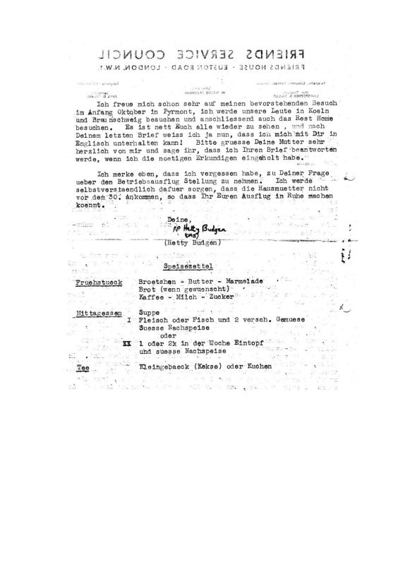 Am 24. März 1935 trat der »Arbeitsausschuß« in Bad Pyrmont zusammen, um auf die Wiedereinführung der allgemeinen Wehrpflicht (16. 03. 1935) zu reagieren. Er verabschiedet als »Deutsche Jahresversammlung der Religiösen Gesellschaft der Freunde (Quäker)« einmütig das »Friedenszeugnis«. Darin heißt es: »Angesichts der Wiedereinführung der Allgemeinen Wehrpflichtin Deutschland erneuern wir das Bekenntnis zum Frieden . . . Wir glauben, daß auch heute weder den Völkern noch den einzelnen Menschen Glück und Friede durch Krieg und Gewalt gebracht werden,sondern allein durch die Kraft einer Gesinnung, die allen Anlaß zu Streit wegnimmt«. Manche Menschen, die mit dem NS-Regime nicht einverstanden waren, gerieten bald nach 1933 in Bedrängnis oder seelische Konflikte. Ihnen halfen die Quäker. Ihr Hilfswerk, das »Relief Work« in London, bildete ein »German Emergency Committee«. Dieses beschloß, in Deutschland »rest-homes« einzurichten, also Häuser zum Ausruhen, in die man diese Menschen einladen wollte. Frei von äußerlichen Schwierigkeiten sollten sie darin eine Weile leben können und Gelegenheit haben, zu sich selbst zu kommen und sich in der Welt zurechtzufinden. Im November 1933 wurde von der Engländerin Helen Dixon im Hotel Schmidt in Falkenstein im Taunus ein während der Saisonpause des Betriebes halbjährlich geführtes rest-home eingerichtet. Im Herbst 1934 konnte sie im St. -Josephs-Haus in Bad Pyrmont ein ebenfalls halbjährlich betriebenes rest- home eröffnen. Das Sankt-Josephs-Haus war damals Eigentum des amerikanischen Ordens der »Armen Franziskanerinnen«. Die Novizen des Hauses besaßen die amerikanische Staatsangehörigkeit. Vielleicht blieb das rest-home auch mit aus diesem Grunde in der NS-Zeit unbehelligt. Der Aufenthalt für die eingeladenen Gäste blieb immer auf vierzehn Tage begrenzt. Allerdings sollen einige Gäste mehrfach dort gewesen sein. Aus Sicherheitsgründen wurden keine Anwesenheitslisten geführt. Einer der Gäste war Ernst Reuter, nachmals Regierender Bürgermeister von Berlin. Bei Kriegsanfang wurde das rest- home geschlossen. Die während seines Bestehens geknüpften Beziehungen zu Engländern vermochten den Zweiten Weltkrieg zu überdauern. Noch 1945 reiste die Quäkerin W. F. Howard in die Britische Besatzungszone, um den Deutschen zu helfen. Sie traf Ostern 1946 zusammen mit der Engländerin Rosamund Wallis, die fließend deutsch sprach - beide Frauen auf Anordnung der Britischen Militärregierung in die schlichte, mit Quäkerstern versehene Quäkeruniform gekleidet - in Bad Pyrmont ein und gründete im St. -Josephs-Haus wieder ein rest-home. Dem Sitz der englischen Quäker, dem »Friendshouse« in London, aber auch den Quäkern des europäischen Festlandes, galt ja immer noch der Badeort Bad Pyrmont als ein Mittelpunkt ihrer Religionsgemeinschaft, und das Quäkerandachtshaus auf der Bombergallee war ihnen ein fester Begriff. Die Verantwortung für das rest-home und den größten Teil seiner Finanzierung übernahm die Militärregierung. Mit der Entstehung des Landes Niedersachsen (21. 11. 1946) ging die Verwaltung in deutsche Hände über. Die Finanzierung übernahmen die Quäker in England, der »Friends Service Council«. Bald wurde das rest-home in das Birkenhaus verlegt und dort von deutschen Hausmüttern geleitet. Als solche waren dort un- ter anderen Frau Elisabeth Jankowski und Frau Brigitte Schaper tätig*). Das rest-home hat seine segensreiche Tätigkeit bis 1962 ausgeübt. Dann wurde es geschlossen. Das »Friendshouse« in London war der Meinung, daß Hilfe in anderen Teilen der Welt notwendiger geworden sei. aus: M. Tinnappel-Becker, Die Quäker in Bad Pyrmont (vermutlich 1966)