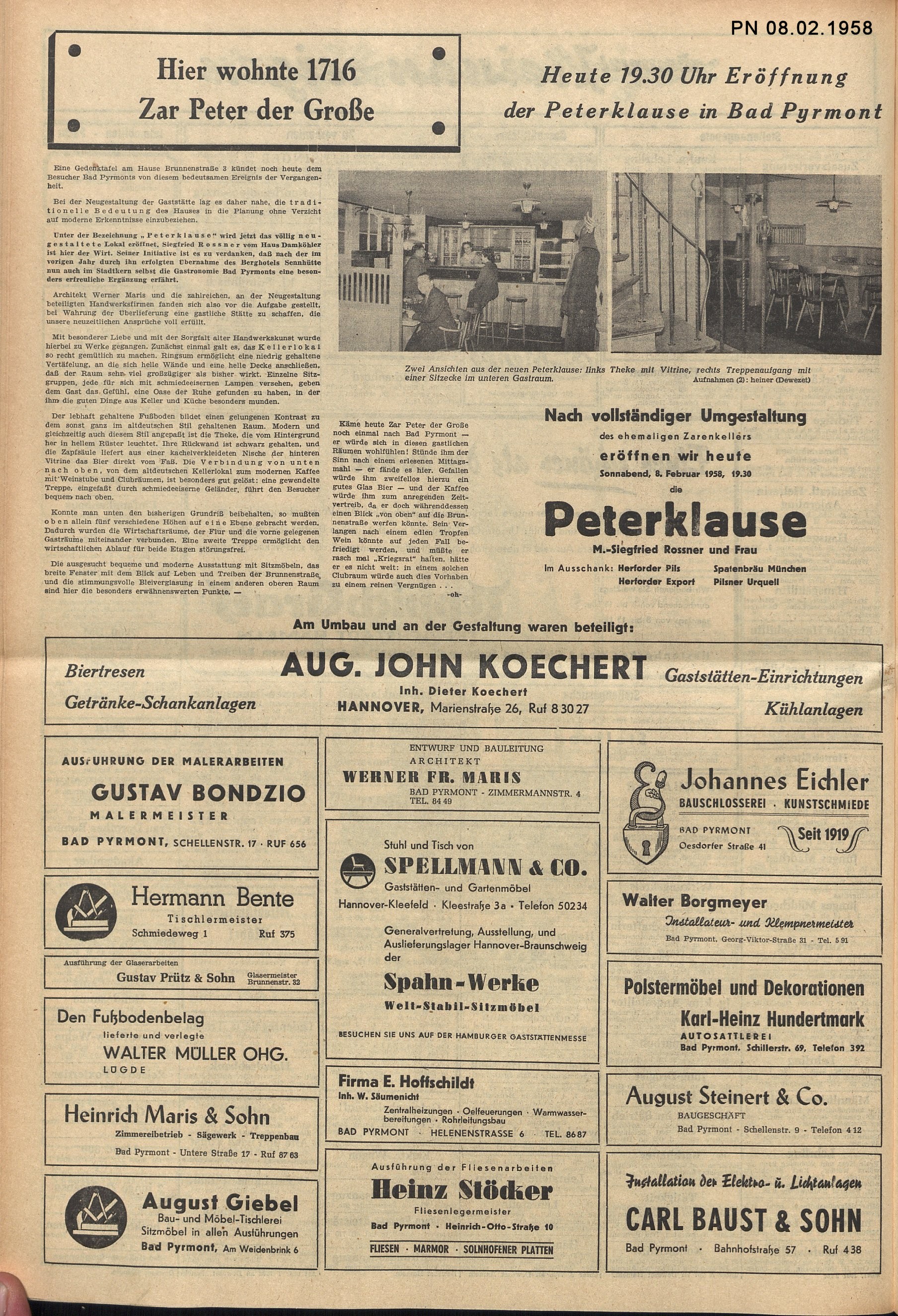 Unter der Bezeichnung „Peterklause“ wird jetzt das völlig neugestaltete Lokal eröffnet. Siegfried Rossner vom Haus Damköhler ist hier der Wirt. Seiner Initiative ist es zu verdanken, daß nach der im vorigen Jahr durch ihn erfolgten Übernahme des Berghotels Sennhütte nun auch im Stadtkern selbst die Gastronomie Bad Pyrmonts eine besonders erfreuliche Ergänzung erfährt.