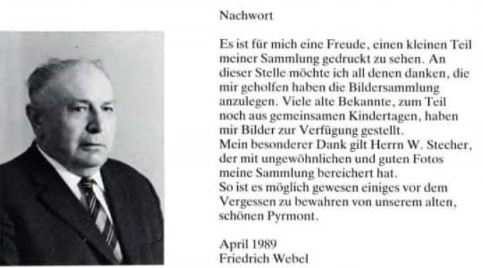 Friedrich Webel im Nachwort seiner Broschüre/seinem Bildband "Pyrmont damals" von 1989: