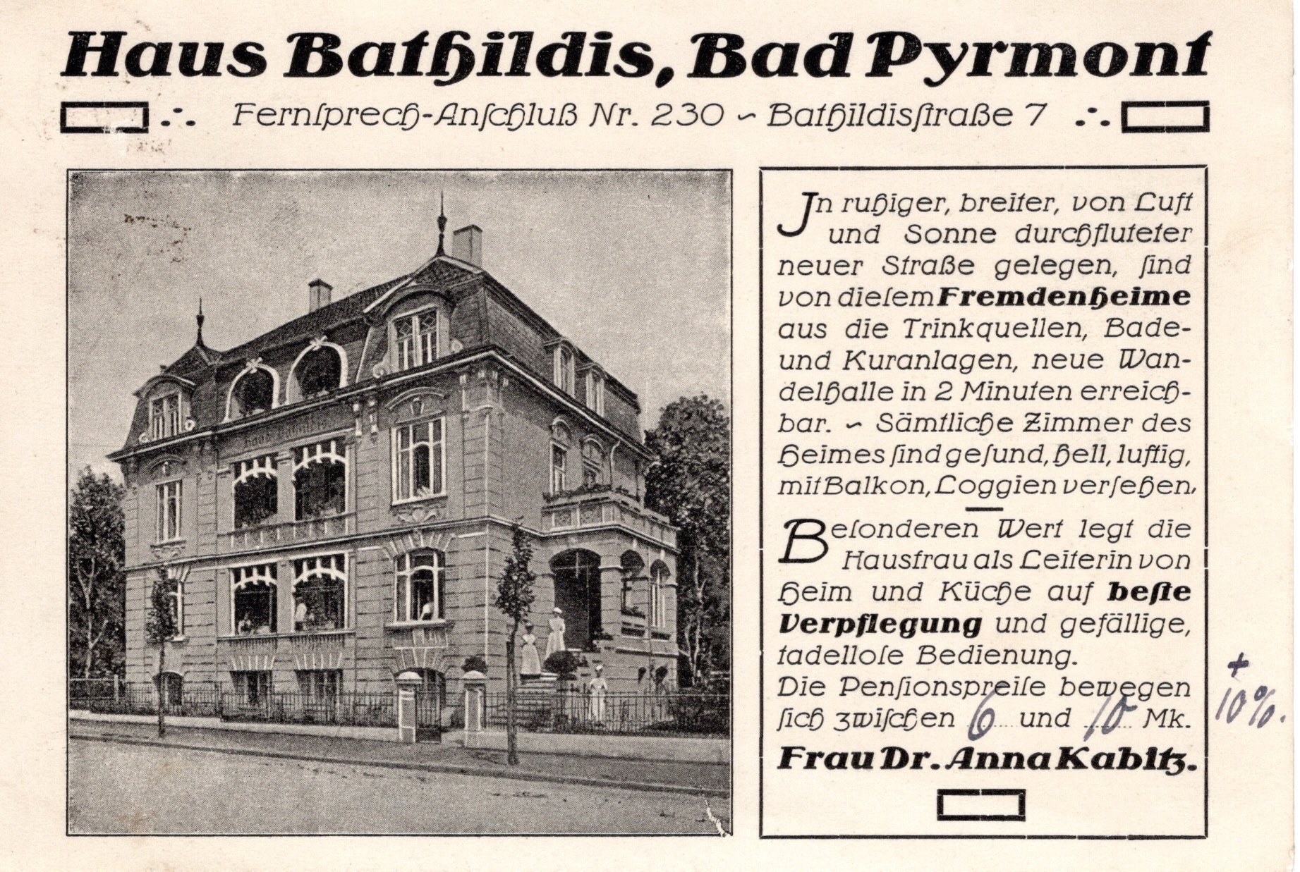 | 11:38, 28. Dez. 2025 | Pyrmont1910 text 19.jpg (Datei) | 663 KB | Aus Pyrmonter Adressbuch von 1910 <div style="display:none;"> Dr. med. Grosch Kurpension Sanatorium BAD PYRMONT am Kurpark neben den Trinkquellen und Bädern Bassinstraße 4 Aufnahme finden alle für Pyrmont geeigneten Patienten, insbesondere Stoffwechsel-, Herz-, Nervenleidende und Rekonvalescenten Diätetische Küche Jeder Komfort Sanatorium und Pension Dr. Enters Brunnenstraße 2 Bad Pyrmont in unmittelbarer Nähe der Trinkquellen und des Badehauses, 1 1/2 Morgen gr… | 1 | |